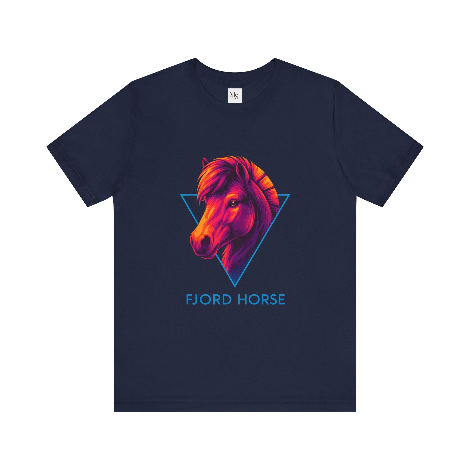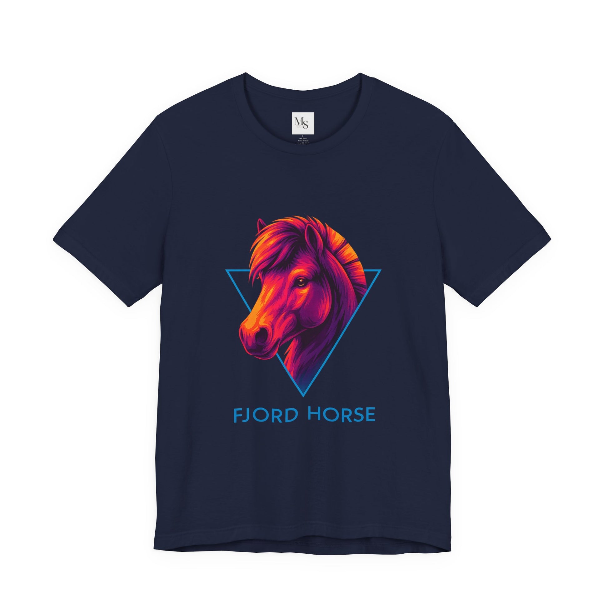 Step into bold color and majestic equine beauty with the Fjord Neon Horse tee, a fusion of retro 80s neon flair and the proud silhouette of the Fjord horse. This shirt captures heads instantly: a glowing horse profile in radiant pinks, purples, and oranges, set against a deep black background, with geometric neon accents that heighten the electric pop. The Fjord Neon Horse tee is perfect for those who love horses, retro style, or simply wearing something that makes a statement.