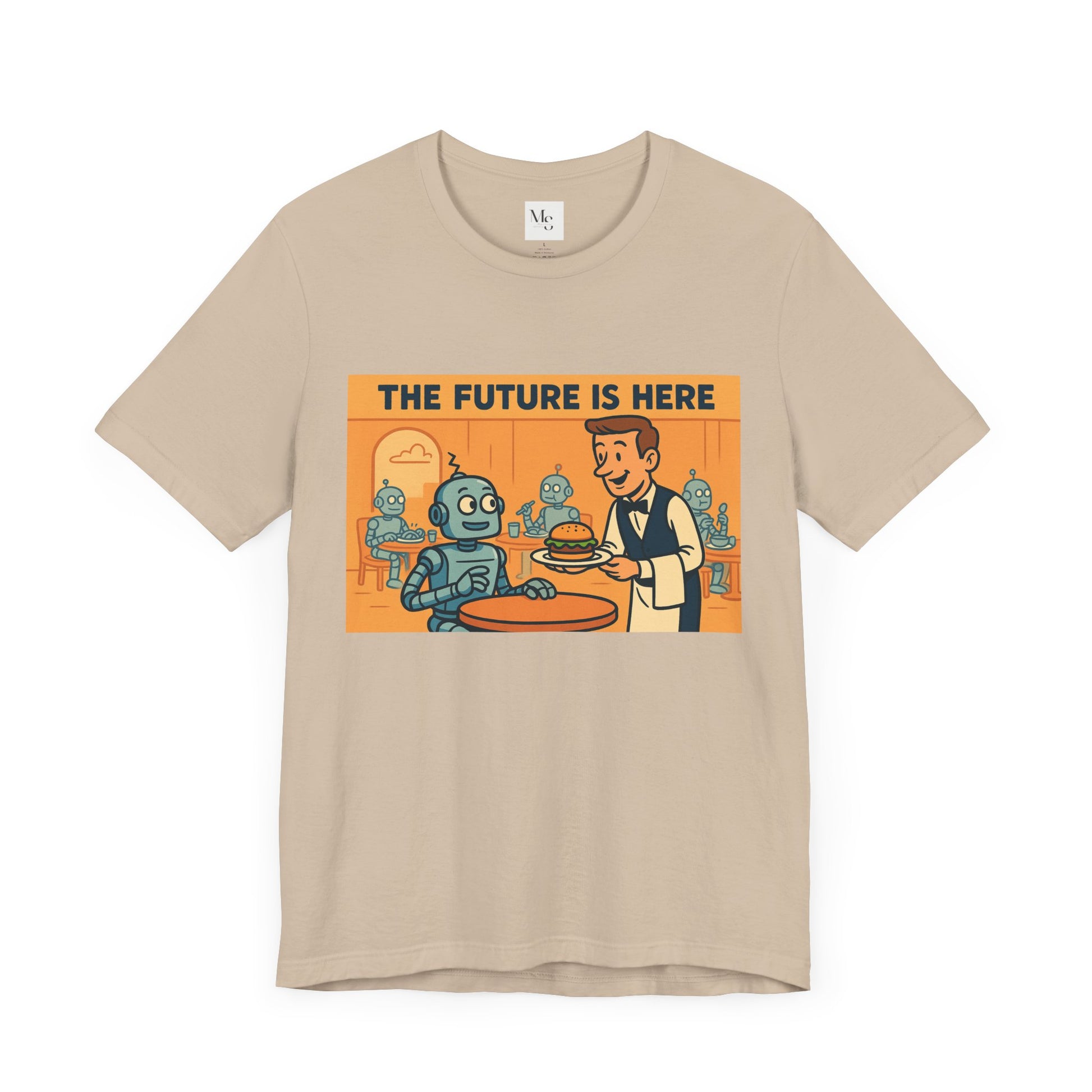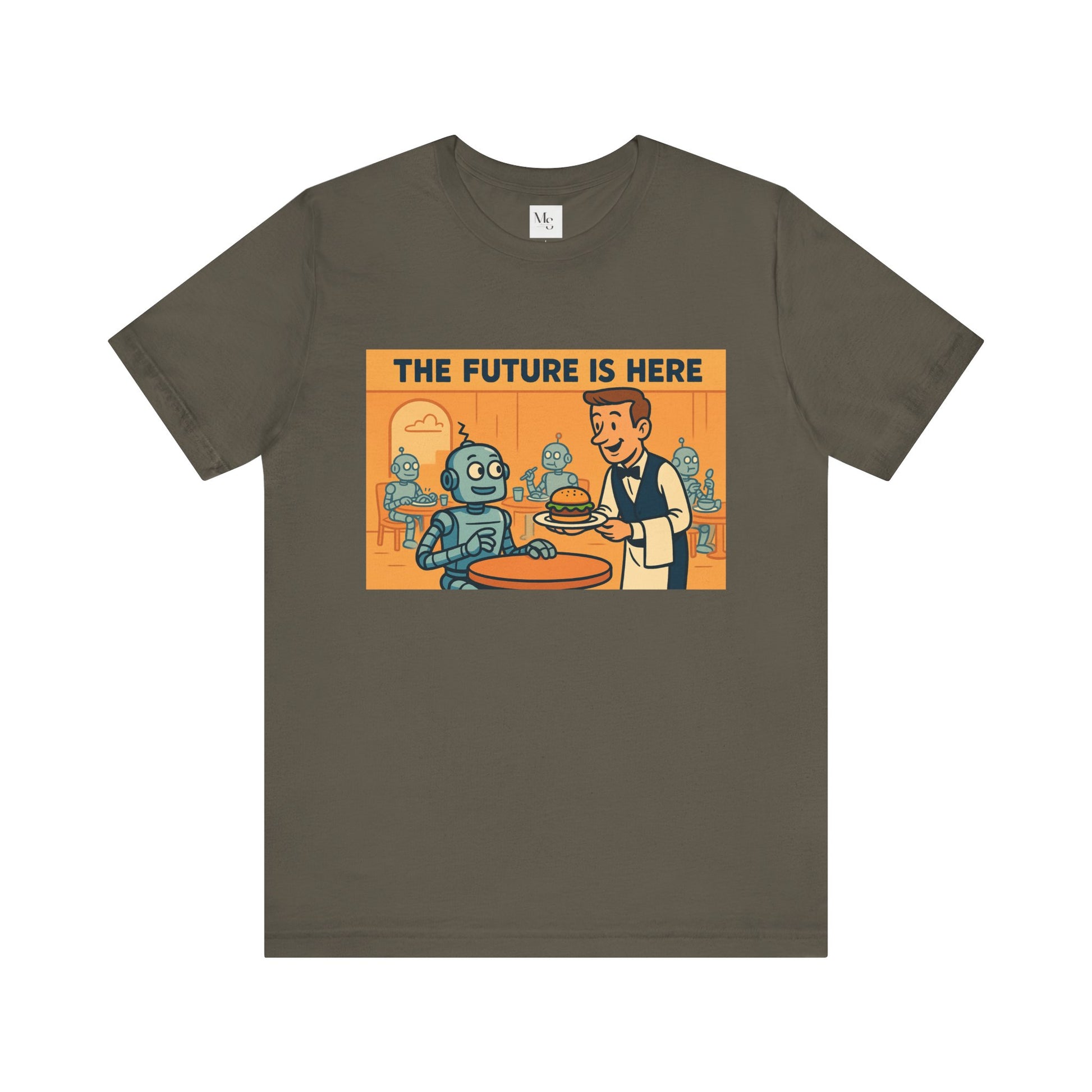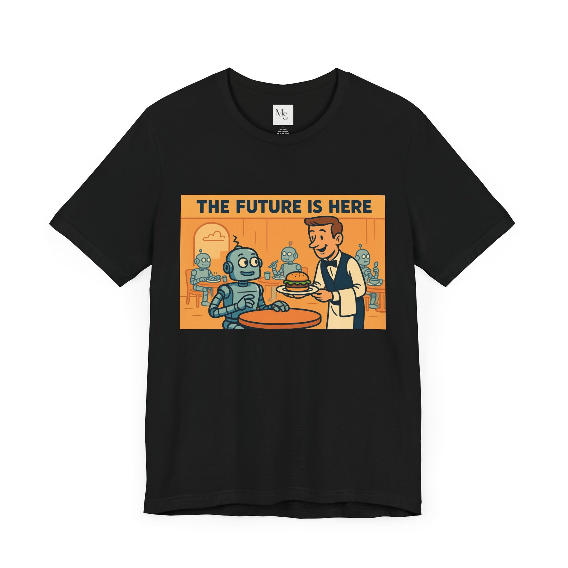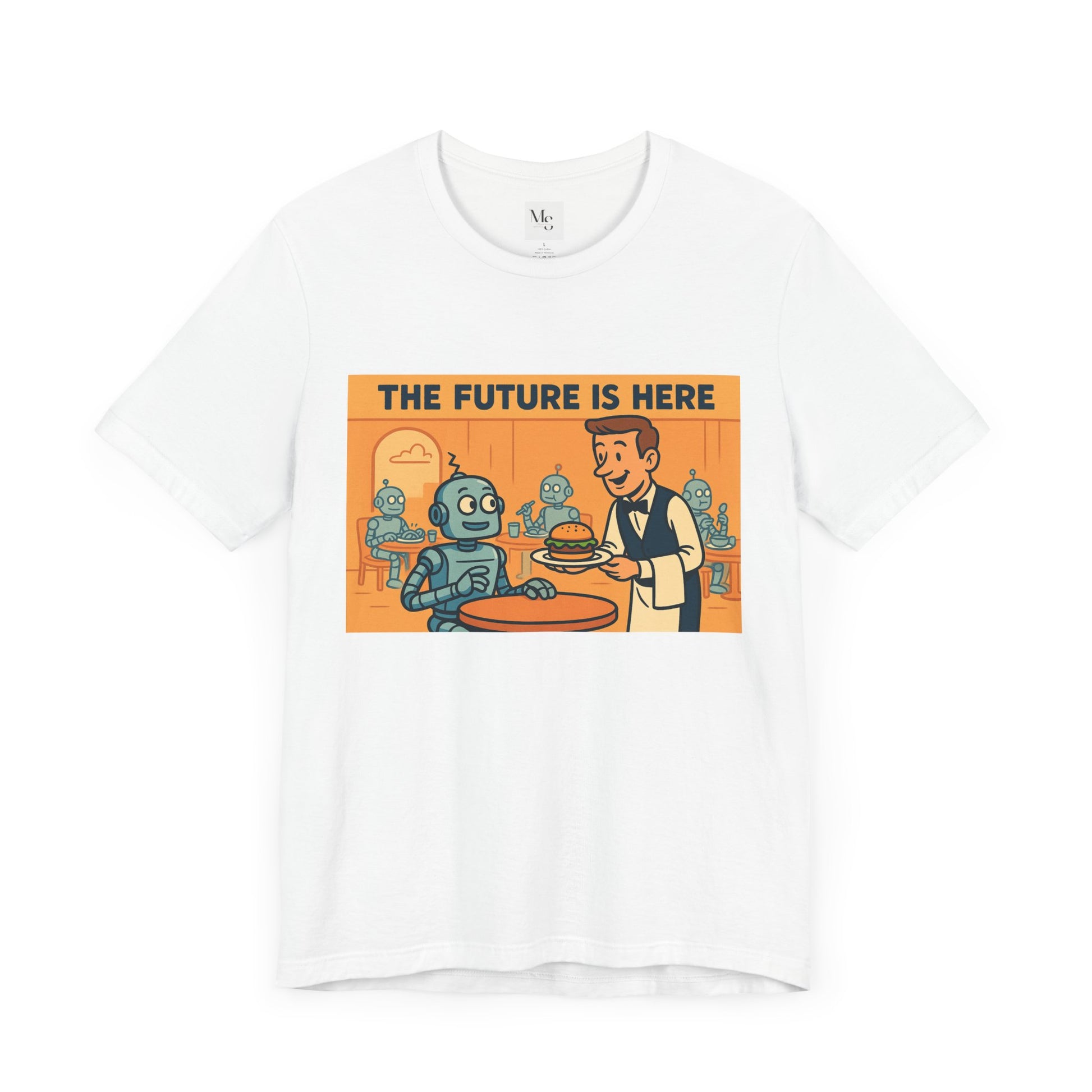 This dysto-chic tee captures that unsettlingly satisfying moment where the machines don’t just rise — they dine. Cold efficiency, warm meals. Welcome to the upgrade.