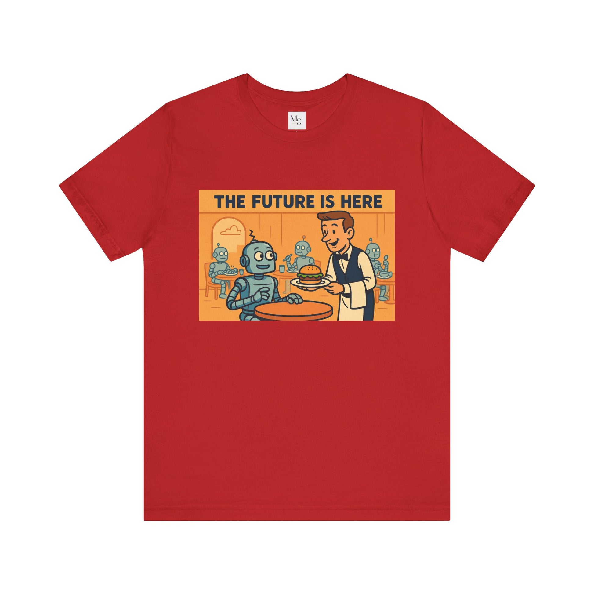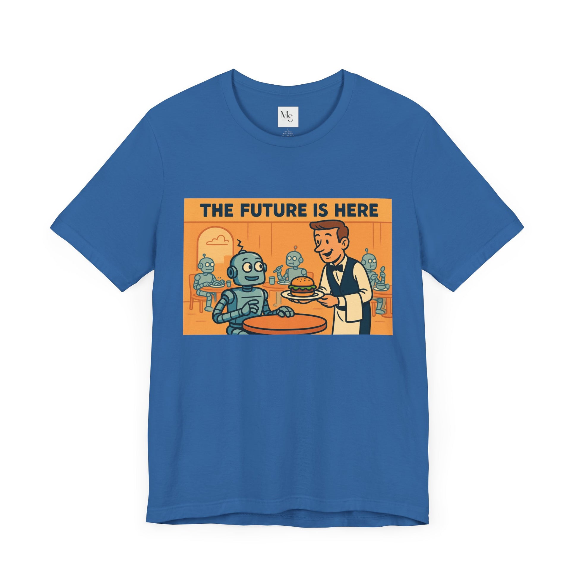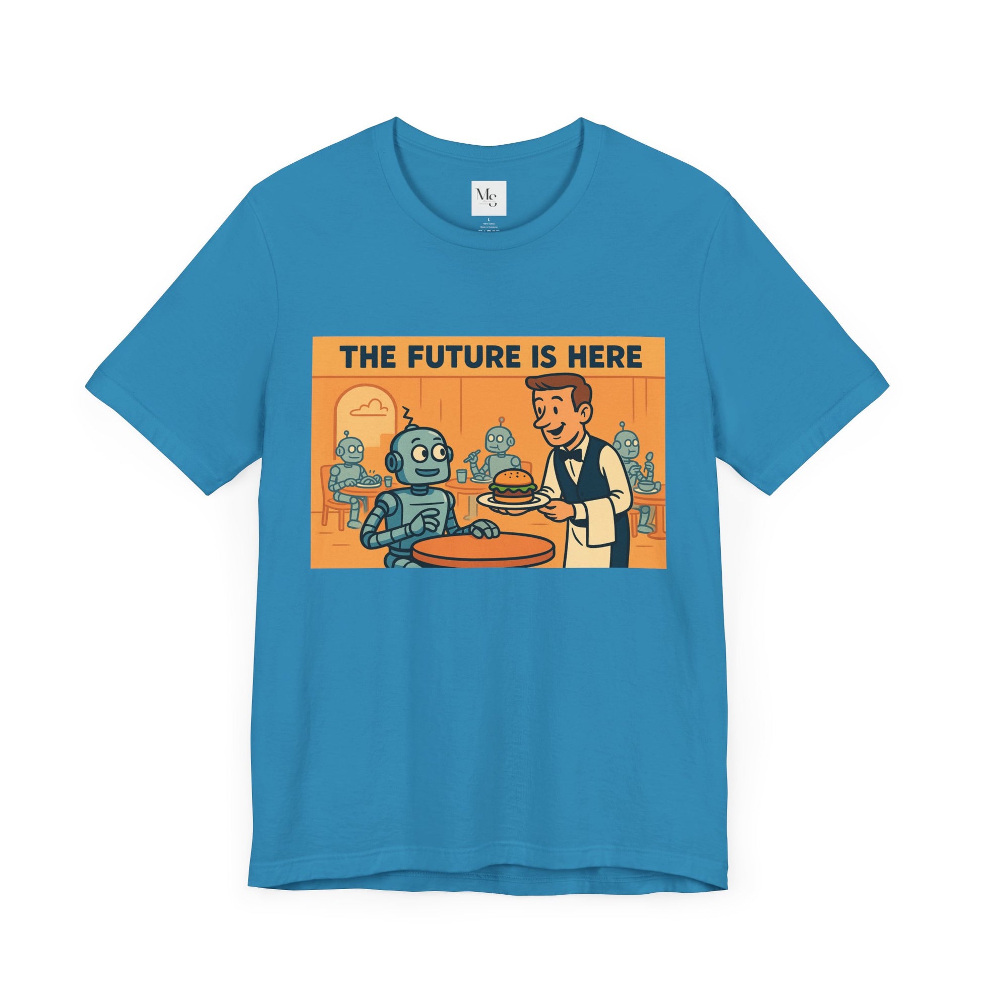 This dysto-chic tee captures that unsettlingly satisfying moment where the machines don’t just rise — they dine. Cold efficiency, warm meals. Welcome to the upgrade.
