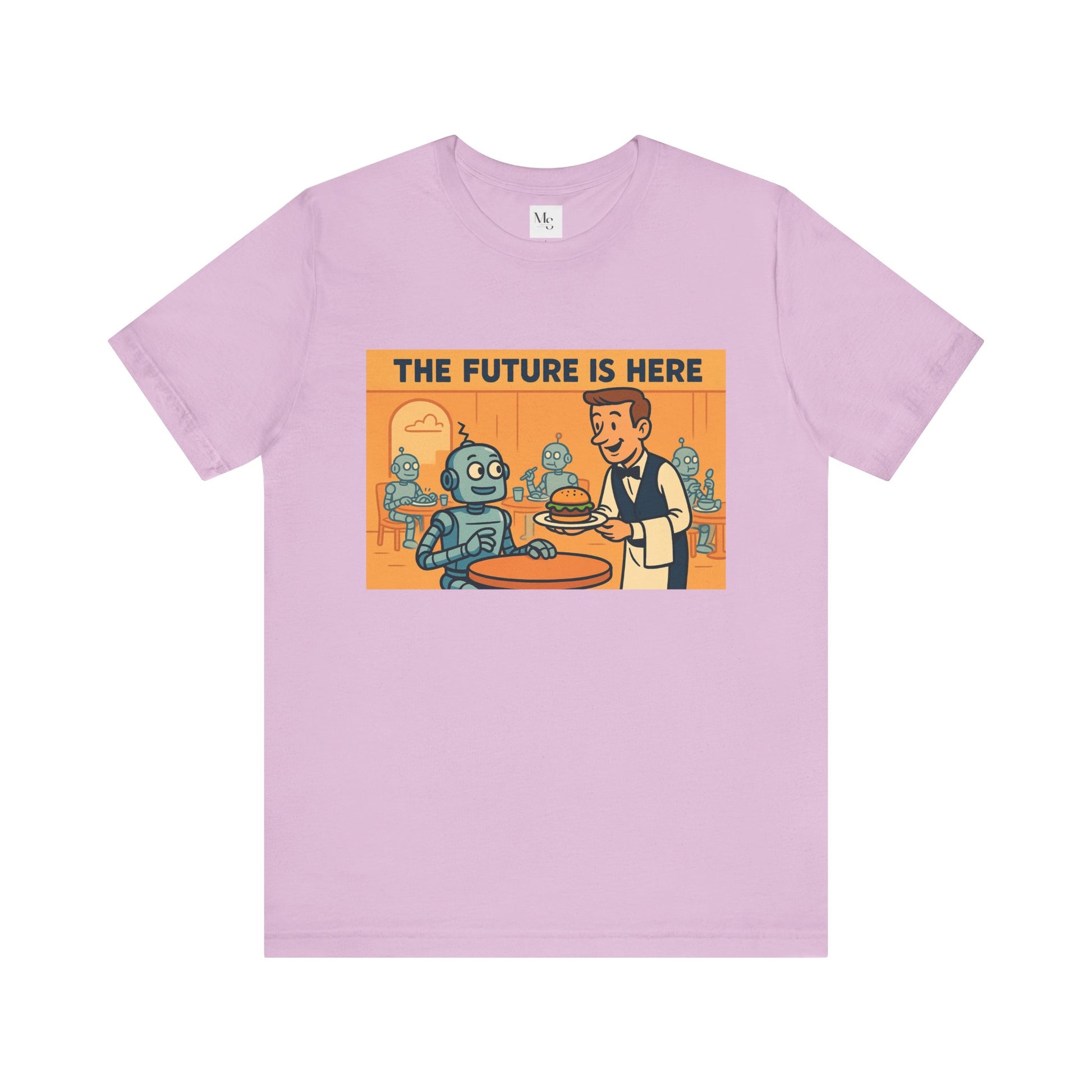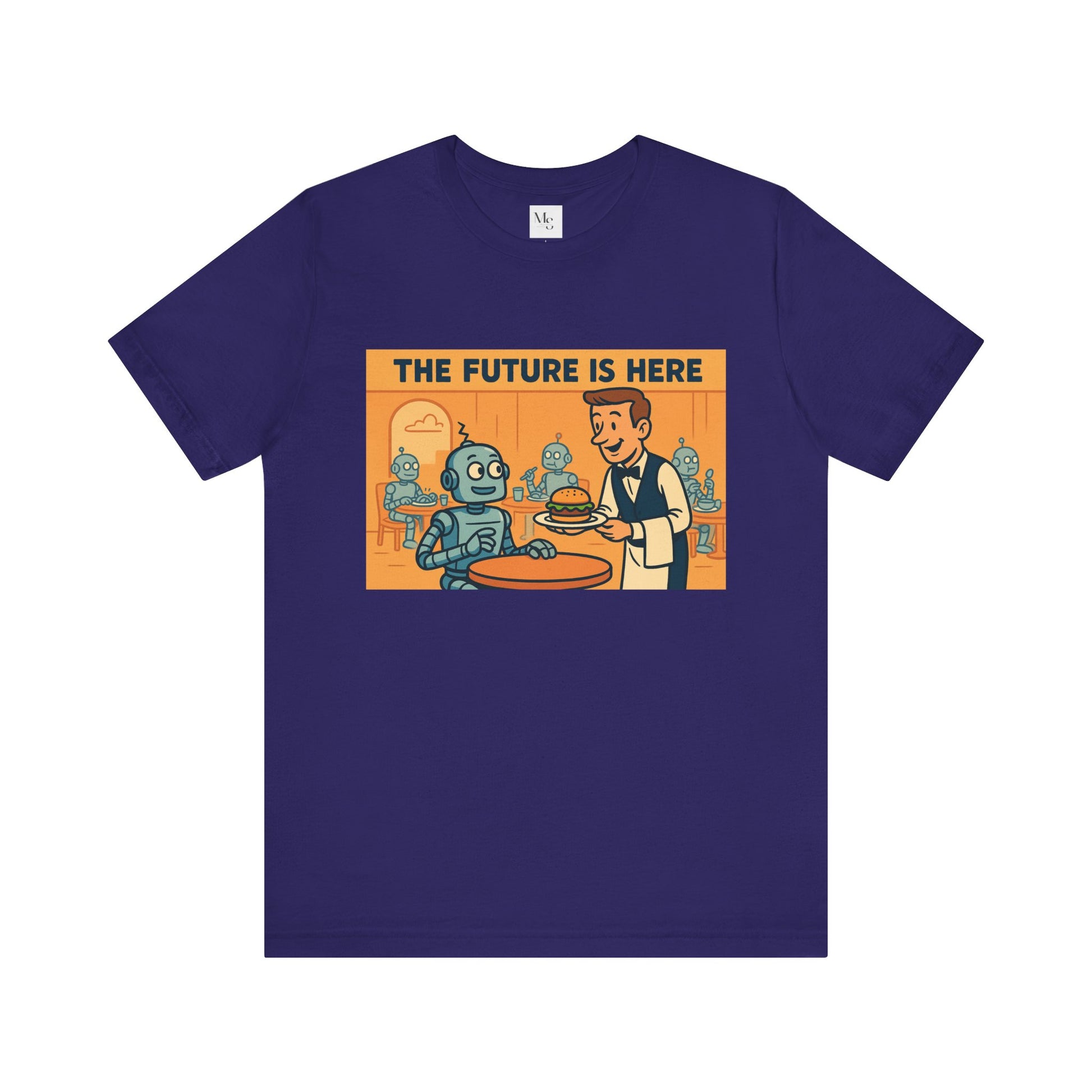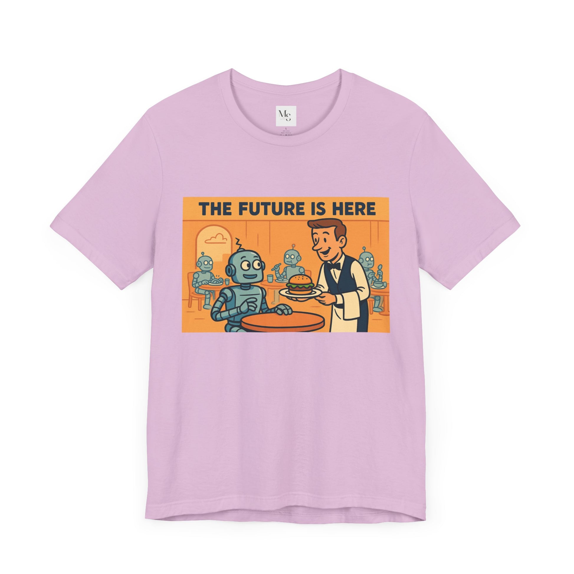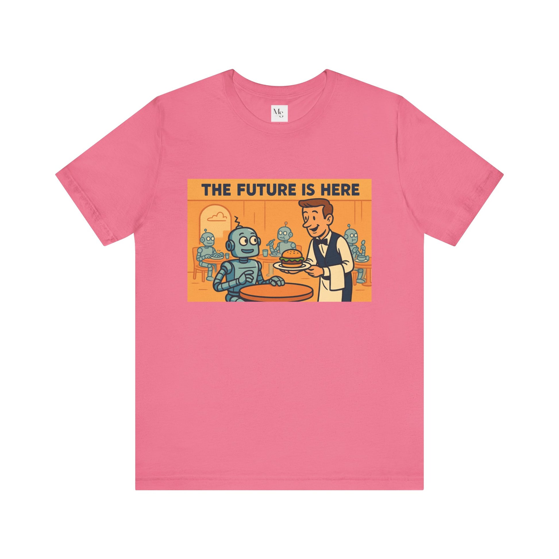 This dysto-chic tee captures that unsettlingly satisfying moment where the machines don’t just rise — they dine. Cold efficiency, warm meals. Welcome to the upgrade.