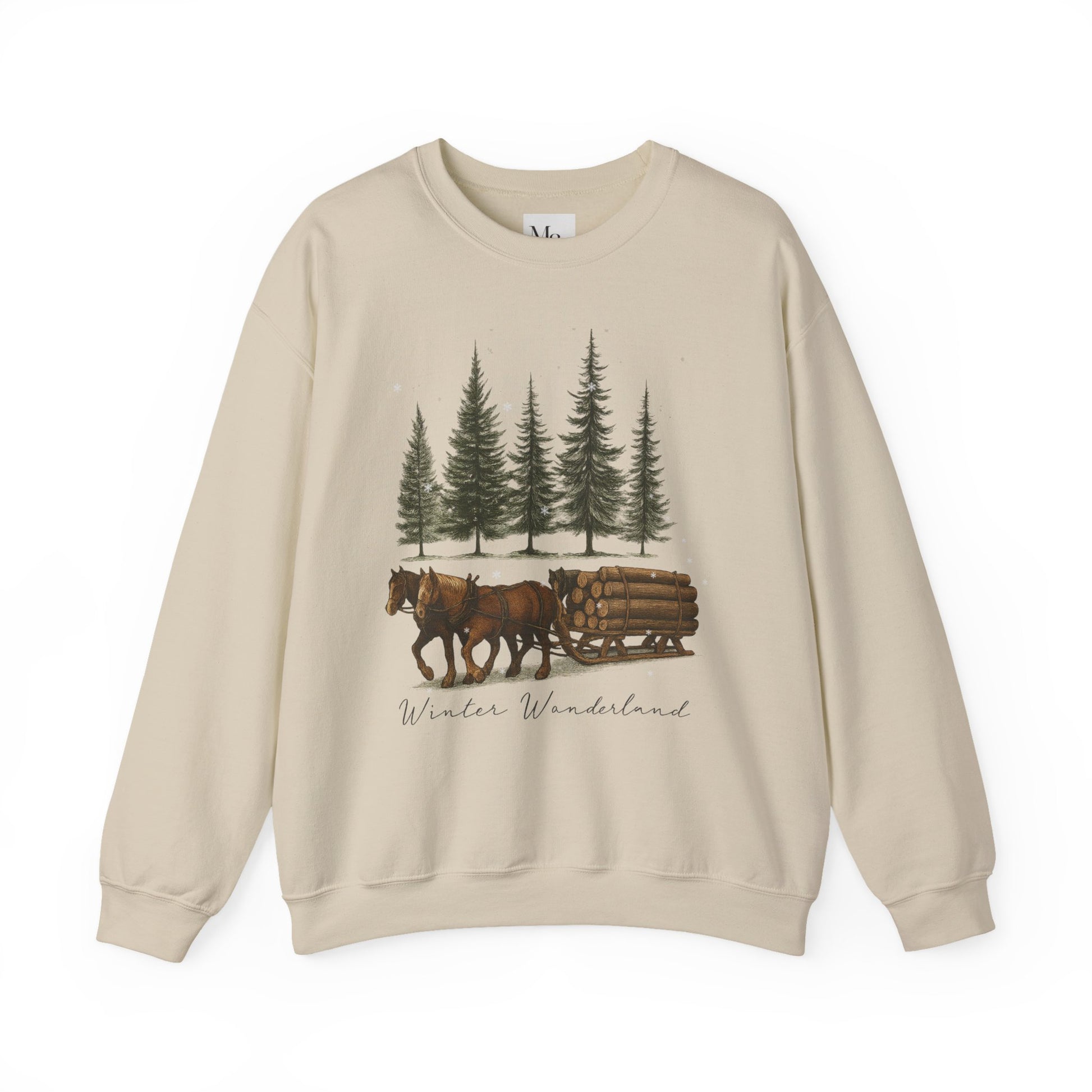 Bring the quiet charm of the snowy woods into your wardrobe with the Winter Wonderland Horse Sweatshirt. This cozy unisex crewneck sweater features a rustic winter scene of two horses pulling a log-laden sleigh through a peaceful forest of pine trees. Whether you're enjoying a cup of cocoa, decorating for the holidays, or heading out on a crisp morning walk, this sweatshirt captures the magic and warmth of the season.